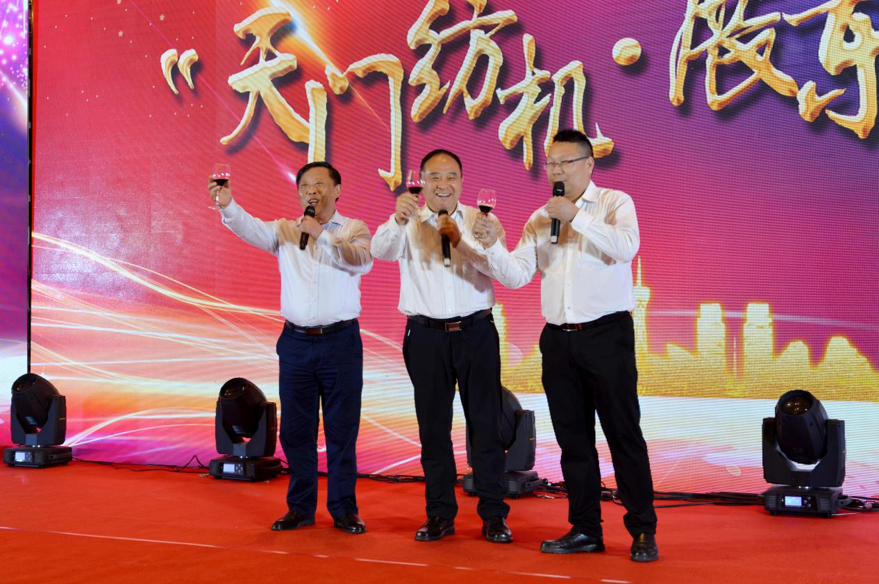 (中國(guó)紗線網(wǎng)總編王果剛、天門紡機(jī)副總經(jīng)理肖少華、展東紡織機(jī)械專件廠總經(jīng)理王國(guó)海晚宴共同祝酒)