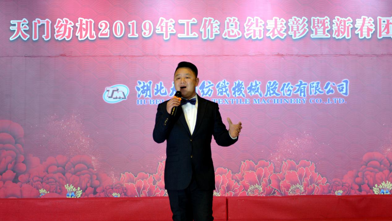 2020年1月21日下午,湖北天門紡織機(jī)械股份有限公司綜合樓多功能廳張燈結(jié)彩、暖流融融,一場主題為“砥礪奮進(jìn)結(jié)碩果、引吭高歌啟新程”的年度總結(jié)表彰暨新春團(tuán)拜會在這里舉行,400多名員工身著公司新佩發(fā)的西服套裝,精神奕奕地走進(jìn)會場。13:00整,三位主持人靚妝登場,宣布2019年度總結(jié)表彰暨新春團(tuán)拜會開始。