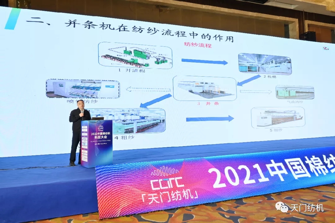 湖北天門紡織機械股份有限公司總經理焦倫進作了《并條機的創(chuàng)新與未來》的專題報告。在報告中,焦倫進總經理介紹了并條機在紡紗流程中的作用,并就目前紡織企業(yè)對并條機創(chuàng)新的要求,從傳動結構及精度、加壓系統(tǒng)、牽伸裝置、清潔系統(tǒng)、部件及提供設備的數字化、信息化、智能化水平等方面進行介紹。最后,焦倫進總經理指出未來并條機將向著梳并聯(lián)合、并粗聯(lián)、短流程一體機在技術上的突破方向發(fā)展。