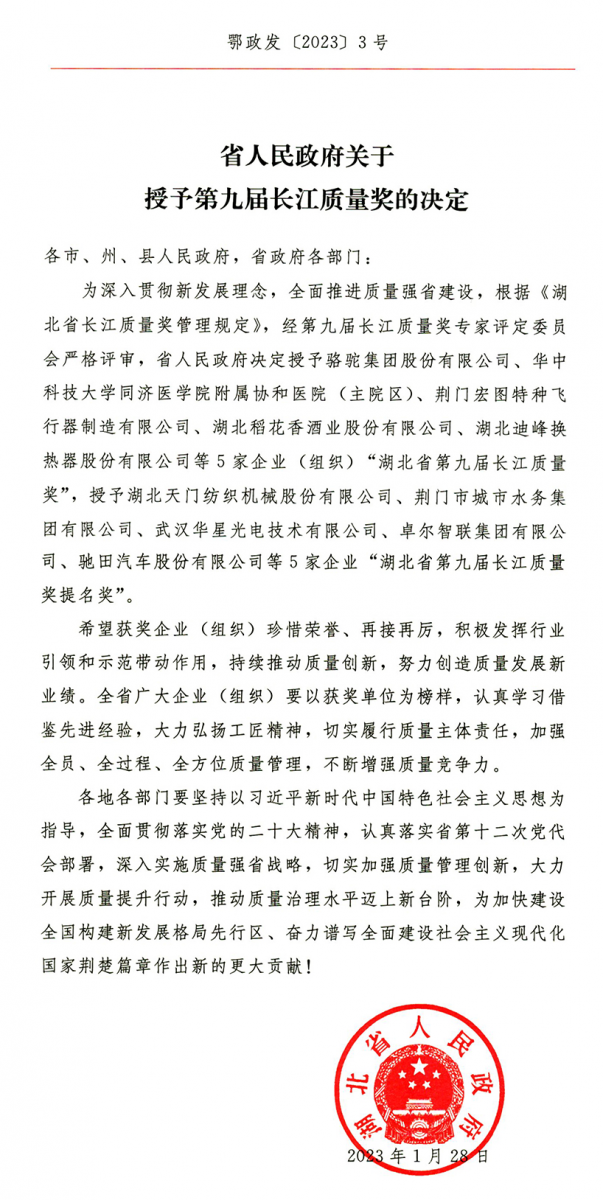 “長(zhǎng)江質(zhì)量獎(jiǎng)”是經(jīng)中央同意,湖北省人民政府設(shè)立的省長(zhǎng)質(zhì)量獎(jiǎng),是湖北省最高質(zhì)量榮譽(yù)獎(jiǎng)項(xiàng),旨在推進(jìn)全省企業(yè)或組織實(shí)施卓越績(jī)效管理模式,推動(dòng)質(zhì)量強(qiáng)省戰(zhàn)略深入實(shí)施,促進(jìn)湖北經(jīng)濟(jì)社會(huì)高質(zhì)量發(fā)展。該獎(jiǎng)項(xiàng)分為“湖北省人民政府長(zhǎng)江質(zhì)量獎(jiǎng)”和“湖北省人民政府長(zhǎng)江質(zhì)量獎(jiǎng)提名獎(jiǎng)”兩個(gè)級(jí)別,每個(gè)級(jí)別不超過(guò)5家企業(yè)(組織),可謂是百里挑一、優(yōu)中選優(yōu)。