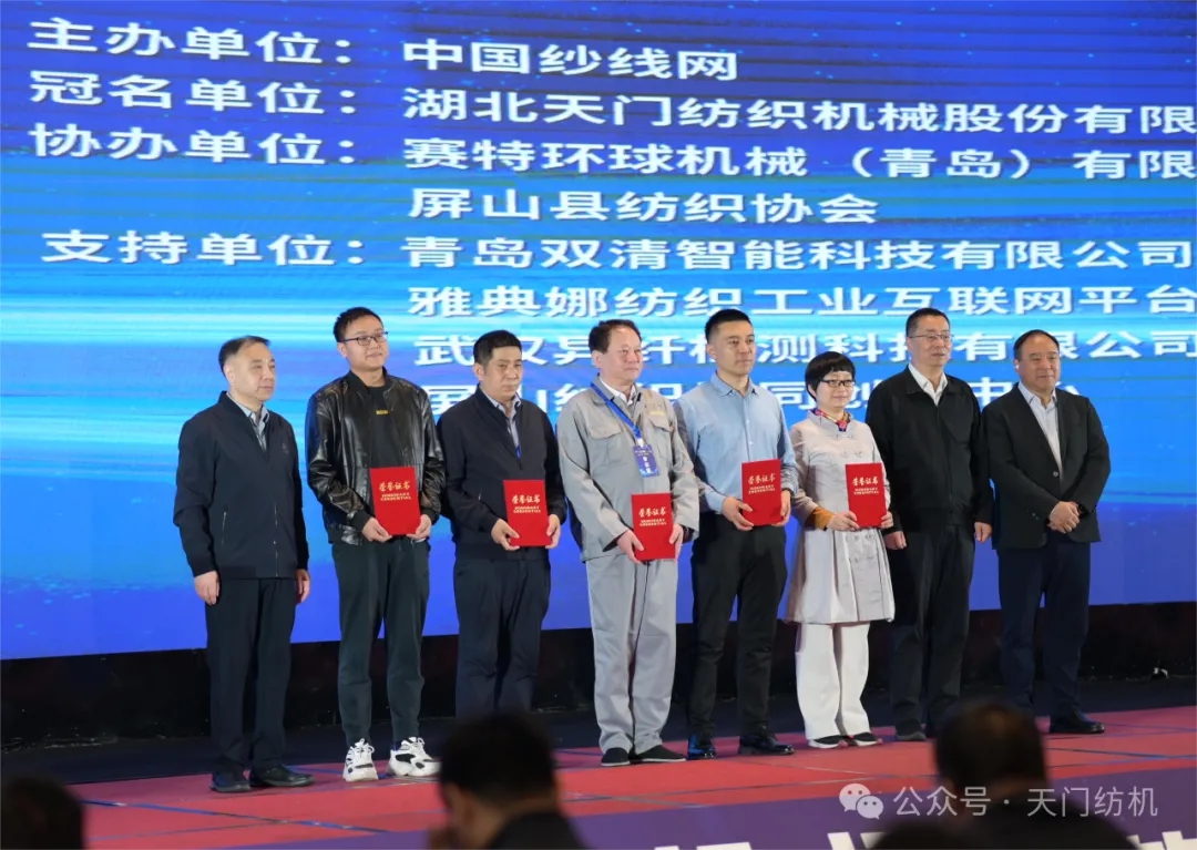 在領(lǐng)導(dǎo)和嘉賓致辭之后,舉行了“天門紡機(jī)杯”第12屆全國紡紗技術(shù)創(chuàng)新研討會(huì)論文頒獎(jiǎng)活動(dòng)。中國紡織機(jī)械協(xié)會(huì)會(huì)長顧平、中國紗線網(wǎng)總編王果剛、天門紡機(jī)總經(jīng)理焦倫進(jìn)為獲獎(jiǎng)作者頒獎(jiǎng)。