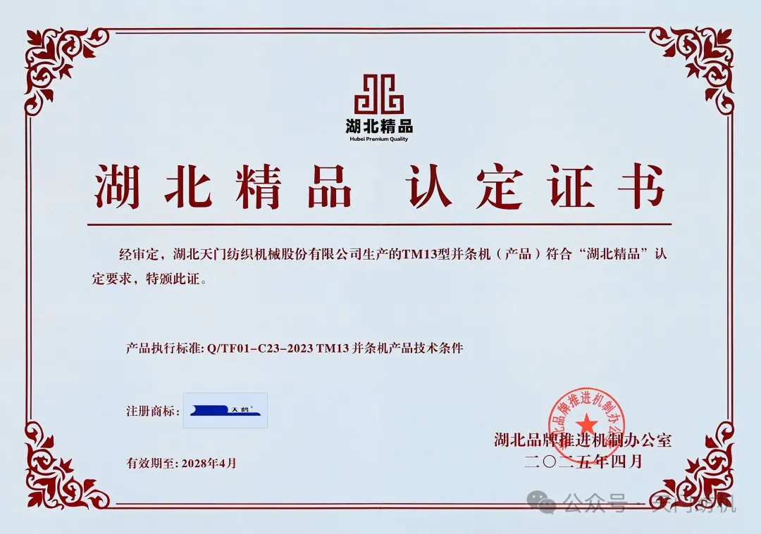 為貫徹落實《湖北省質量強省建設綱要》《建設品牌湖北推動高質量發(fā)展行動綱要》有關部署,湖北省品牌推進機制辦公室從2023年起,正式啟動了“湖北精品”培育認定工作。其中,第二屆動員了562家經(jīng)營主體,有643個(項)產(chǎn)品成功入庫培育,最終161 個(項)產(chǎn)品入列“湖北精品”。天門紡機TM13型并條機脫穎而出,傲立榜單。