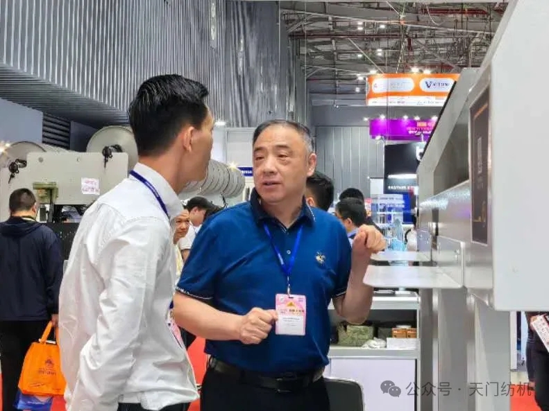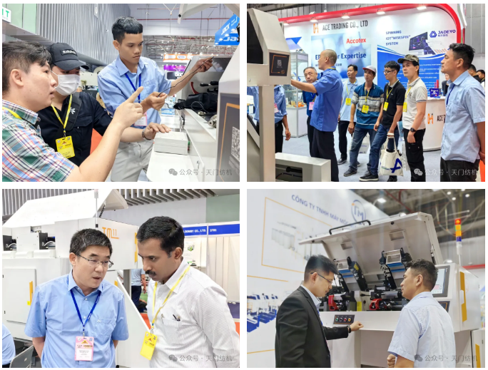越南展會現(xiàn)場人流如織,其中天門紡機(jī)展區(qū)尤為矚目,開展期間分別迎來HANO SIMEX、VICOTEX、HONG LINH、NHA TRANG、THANG CONG、PHU BAI等50余家越南紡企的到訪,T1系列并條機(jī)憑借卓越性能表現(xiàn),引發(fā)現(xiàn)場觀眾駐足,多位老客戶對T1系列并條機(jī)的穩(wěn)定性與高效產(chǎn)能給予高度評價(jià)。