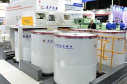 中國紡織機械協(xié)會會長顧平(右2)、福建新華源董事長陳宗立(左2)在天門紡機展位前合影