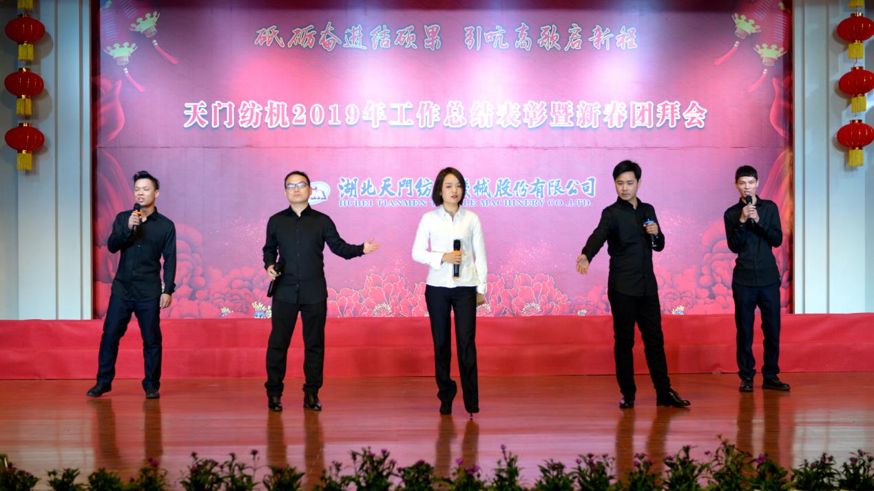 2020年1月21日下午,湖北天門紡織機(jī)械股份有限公司綜合樓多功能廳張燈結(jié)彩、暖流融融,一場主題為“砥礪奮進(jìn)結(jié)碩果、引吭高歌啟新程”的年度總結(jié)表彰暨新春團(tuán)拜會在這里舉行,400多名員工身著公司新佩發(fā)的西服套裝,精神奕奕地走進(jìn)會場。13:00整,三位主持人靚妝登場,宣布2019年度總結(jié)表彰暨新春團(tuán)拜會開始。