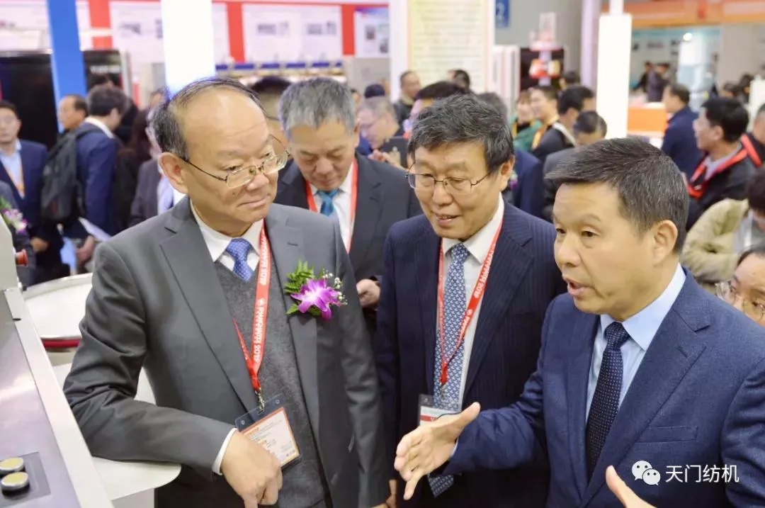 沈方勇董事長(zhǎng)在2019年上海國(guó)際紡機(jī)展上,向中國(guó)紡聯(lián)黨委書記兼秘書長(zhǎng)高勇等領(lǐng)導(dǎo)介紹天門紡機(jī)新產(chǎn)品開發(fā)情況