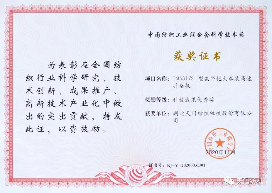 近日,中國(guó)紡織工業(yè)聯(lián)合會(huì)發(fā)布2020年度科技成果優(yōu)秀獎(jiǎng)獲獎(jiǎng)通知,并頒發(fā)證書(shū),天門(mén)紡機(jī)TM3817S型并條機(jī)獲評(píng)“紡織之光”2020年度中國(guó)紡織工業(yè)聯(lián)合會(huì)“科技成果優(yōu)秀獎(jiǎng)”。鄭強(qiáng)、楊家軒、黃必廣、郭升旗、徐紅、譚鵬飛、沈忱等7名研發(fā)人員獲得個(gè)人“科技成果優(yōu)秀獎(jiǎng)”