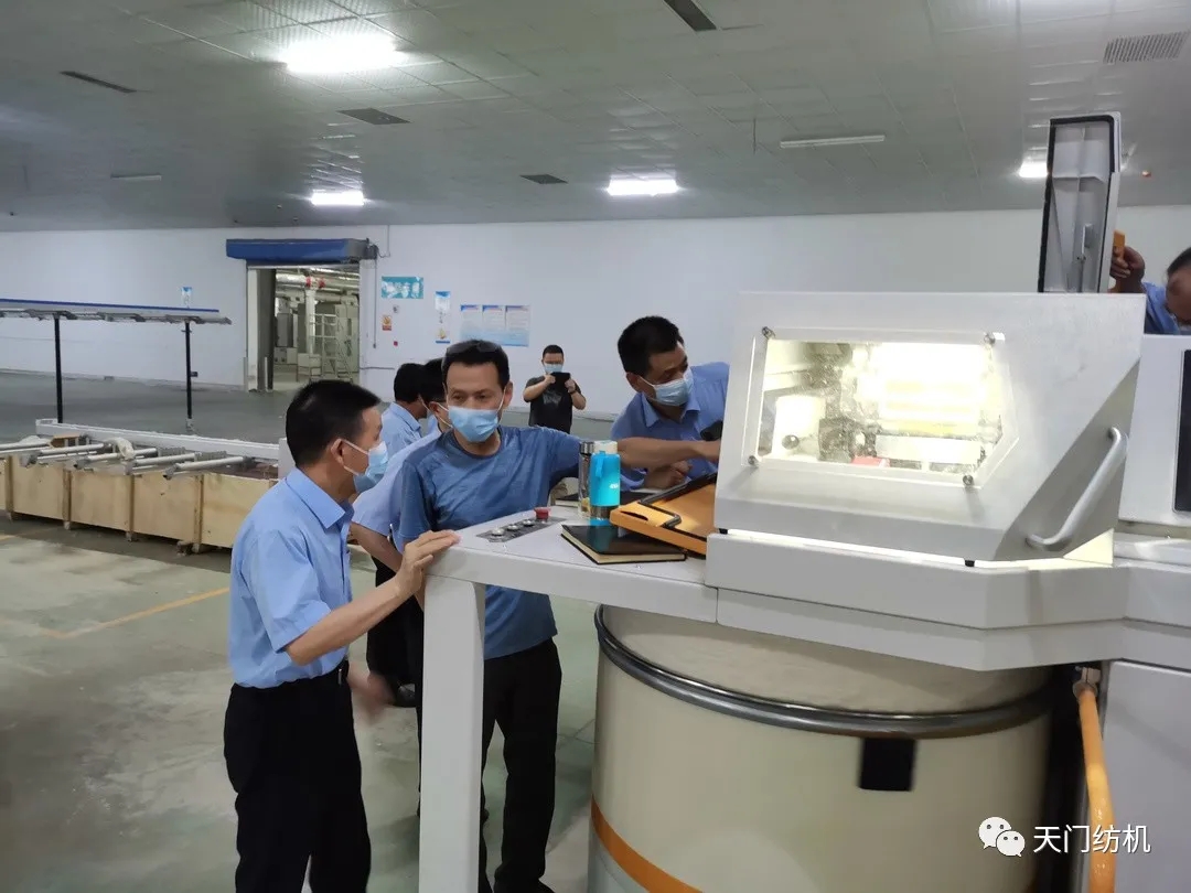天門紡機(jī)“全球首款超大卷裝雙眼高速自調(diào)勻整并條機(jī)”—TM19自6月份上海展會(huì)首次亮相后,已布點(diǎn)在不同客戶處并線試紡3月有余。為了解該機(jī)并線后的真實(shí)使用情況,9月18日,天門紡機(jī)董事長沈方勇、總經(jīng)理焦倫進(jìn)帶領(lǐng)技術(shù)研發(fā)人員組成的TM19評(píng)估組,專程赴卓爾天龍紡織公司,現(xiàn)場(chǎng)考察實(shí)際使用情況,征求客戶意見建議。