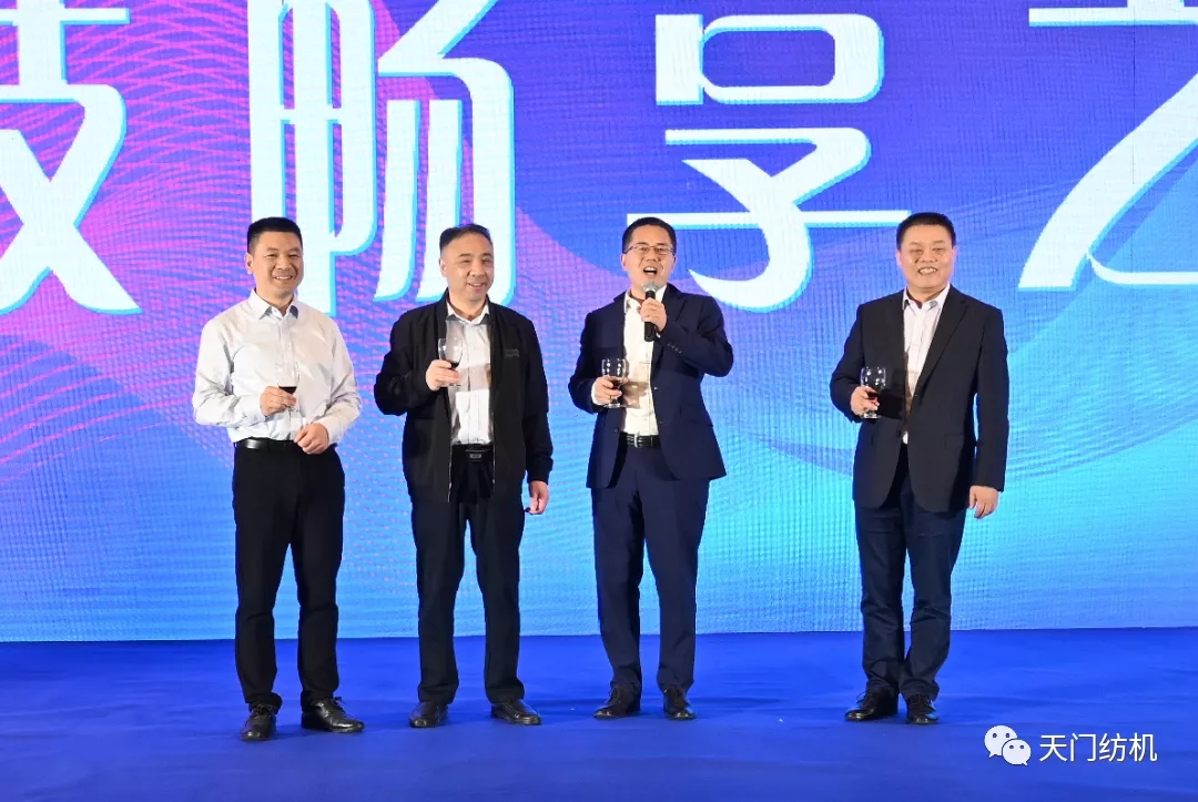 在12日的天門紡機“科技暢享之夜”答謝晚宴上,天門紡機總經理助理楊文峰致詞。中國棉紡織行業(yè)協(xié)會會長董奎勇,天門紡機總經理焦倫進,全國棉紡織科技信息中心主任、《棉紡織技術》期刊社社長劉強,天門紡機總經理助理楊文峰共同為晚宴祝酒。