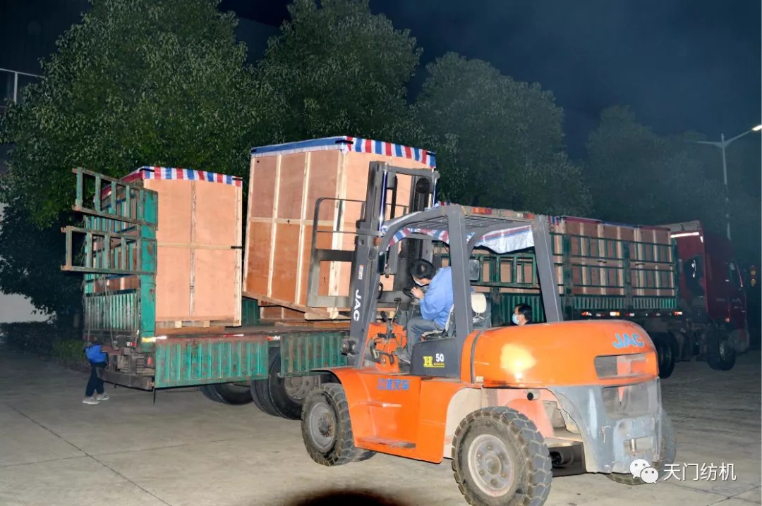 燈火闌珊處,機(jī)器轟鳴聲。已是臘月二十一的晚上,天下著冷冷細(xì)雨,神州大地處處已有年味,但在天門紡機(jī)廠區(qū)仍然一派繁忙景象:數(shù)萬平米的車間內(nèi)全都燈火輝煌,工人們緊張有序的在工作;車間外,幾輛大貨車一字形排開,正在上貨發(fā)往淮北華孚和魯泰紡織。
