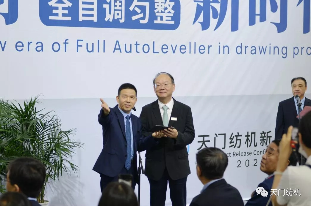 2021年6月12日,在上海國際紡機(jī)展上天門紡機(jī)舉行“開創(chuàng)并條工序全自調(diào)勻整新時(shí)代”新品發(fā)布會,中紡聯(lián)黨委書記高勇使用手持終端為新產(chǎn)品開機(jī)
