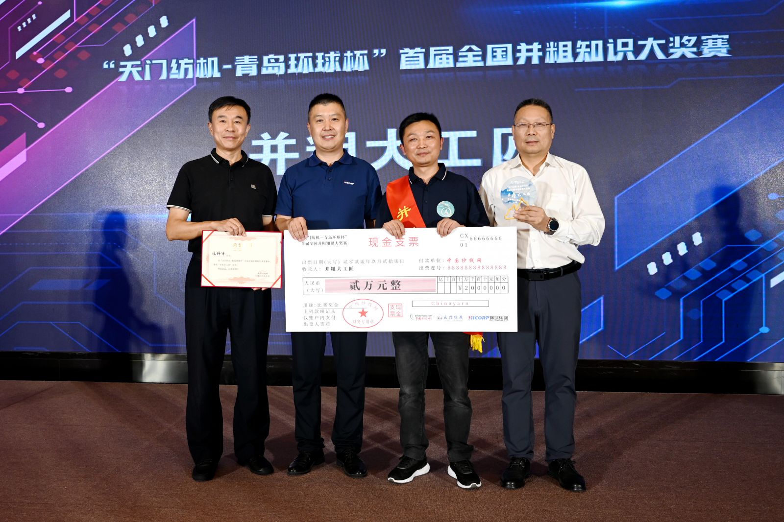 這是一場別開生面的競賽學(xué)習(xí)活動,6位選手的精彩表現(xiàn)不斷地贏得熱烈的掌聲,江蘇悅達(dá)馮傳軍以888分獲得“天門紡機-青島環(huán)球杯”首屆全國并粗知識大獎賽-爭霸賽冠軍,為歷時3個月的大賽活動劃上圓滿的句號?,F(xiàn)場爭霸賽結(jié)束后,隆重舉行了頒獎活動,現(xiàn)場頒發(fā)“企業(yè)優(yōu)秀組織獎”、“并粗工匠獎”、“并粗大工匠獎”。天門紡機副總經(jīng)理肖少華、賽特環(huán)球營銷總監(jiān)陳濤、中國紗線網(wǎng)總裁鞠彥軍為大賽活動致辭并頒獎。