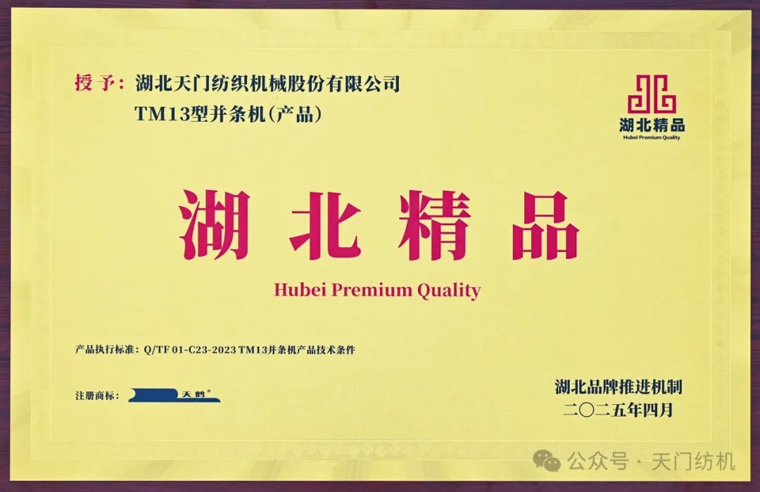 為貫徹落實《湖北省質量強省建設綱要》《建設品牌湖北推動高質量發(fā)展行動綱要》有關部署,湖北省品牌推進機制辦公室從2023年起,正式啟動了“湖北精品”培育認定工作。其中,第二屆動員了562家經(jīng)營主體,有643個(項)產(chǎn)品成功入庫培育,最終161 個(項)產(chǎn)品入列“湖北精品”。天門紡機TM13型并條機脫穎而出,傲立榜單。